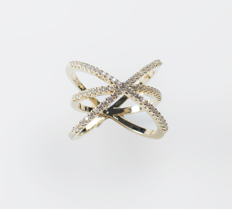 Anillo Elegante, con Diseño Cruzado, Chapa de Oro 18k, Moderno y Sofisticado, Diseño Moderno, Diseño Atemporal, Diseño con Zirconias
