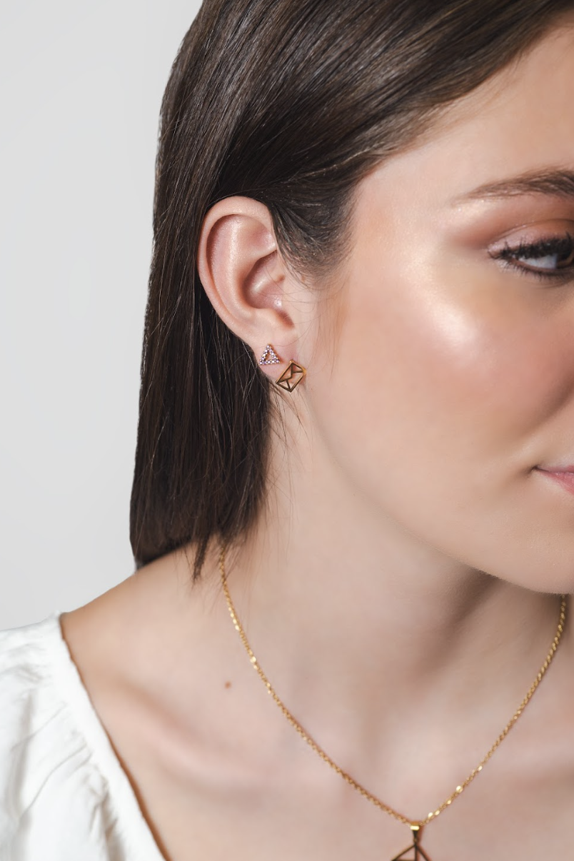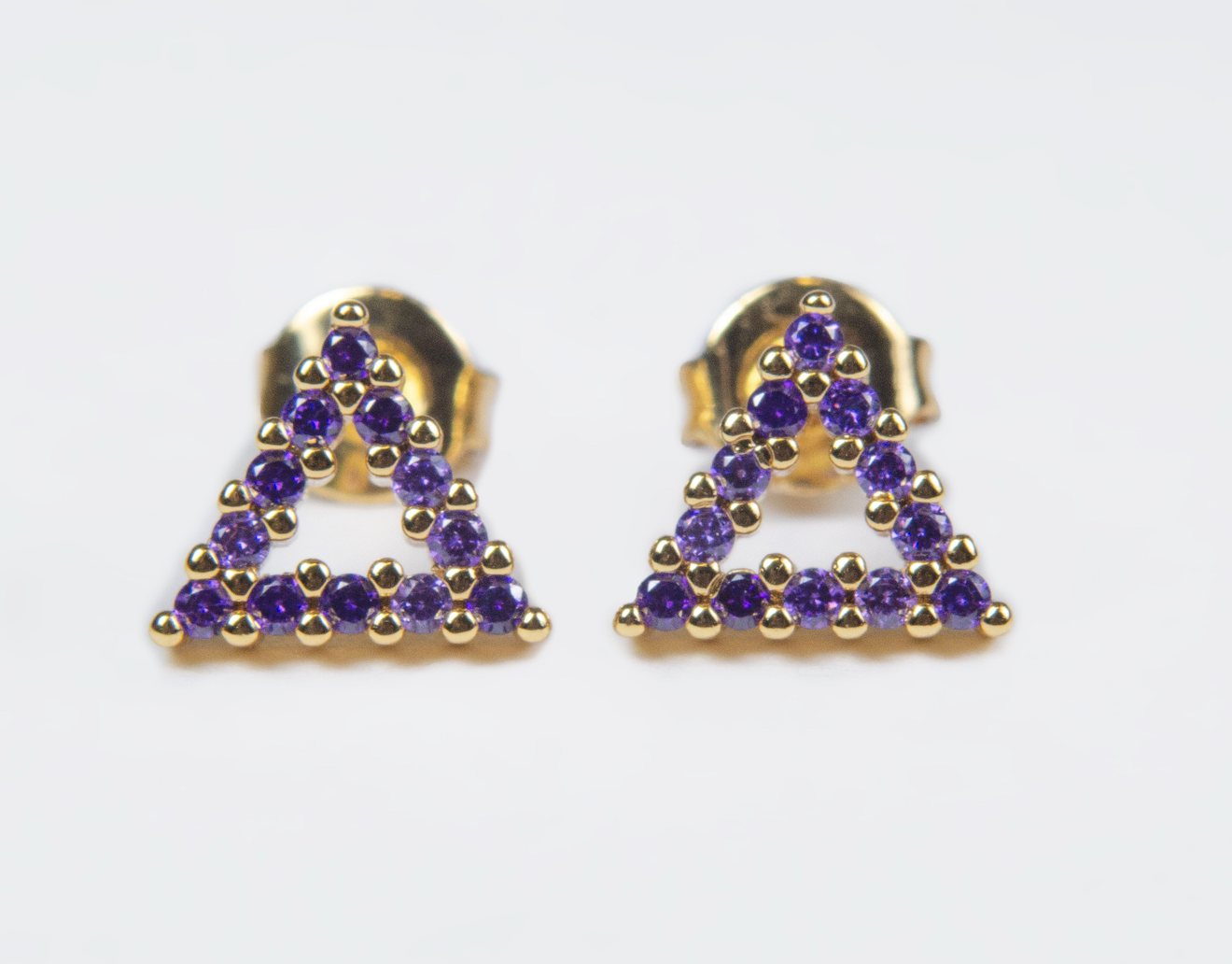 Eleva tu look con estos delicados aretes tringulares. Su diseño minimalsta y atemporal, combinado con el brillo de las zirconias moradas los convierte en el accesorio para cualquier ocasión