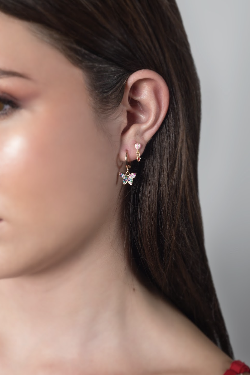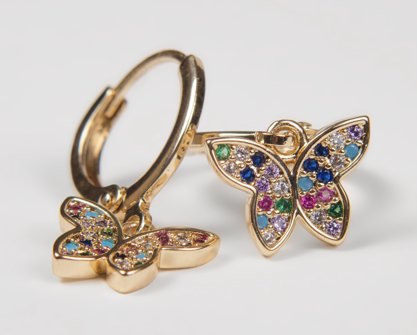 Elegantes aretes de aro con dije de mariposa en chapa dr oro con incrustaciones de zirconias en colores. Perefectos para un look femenino y divertido