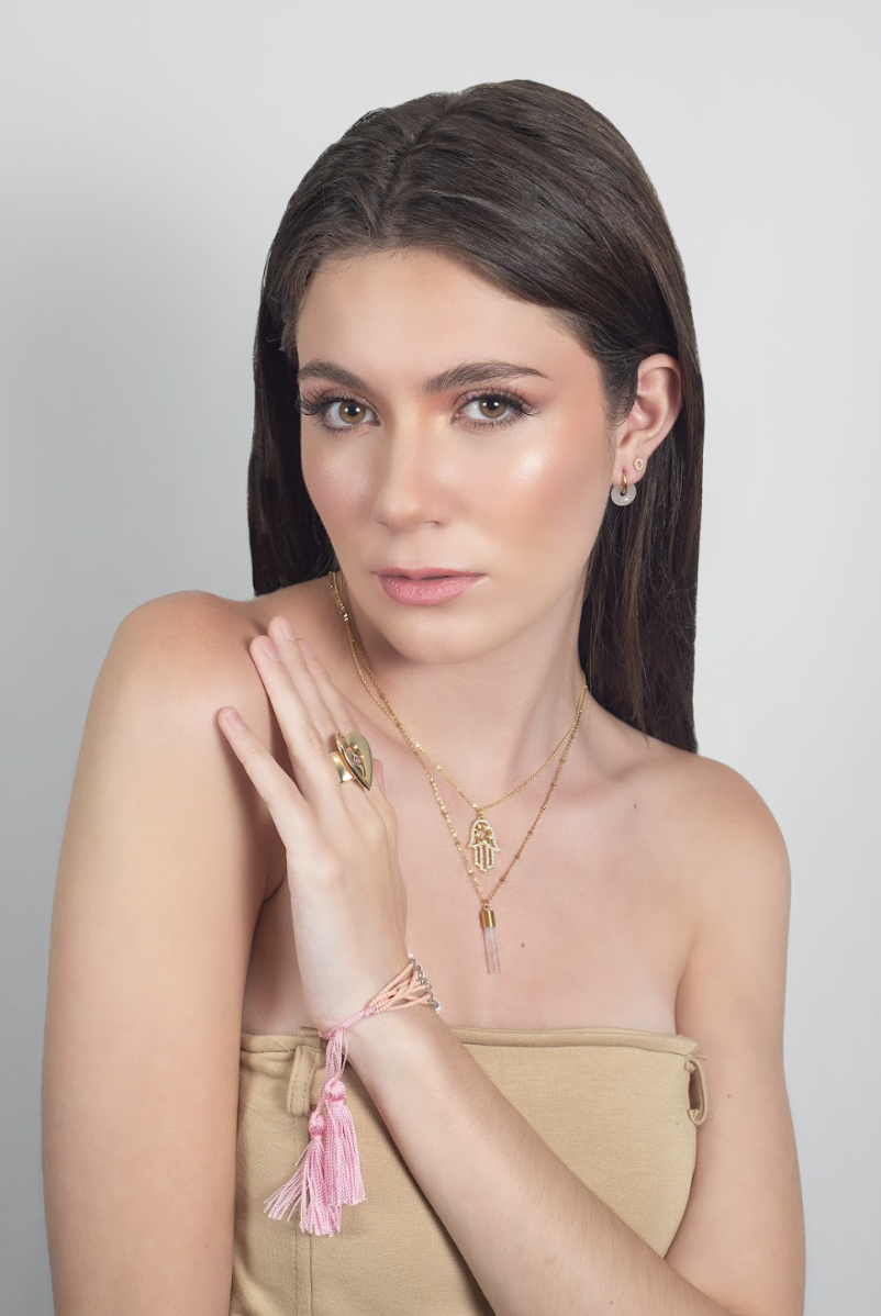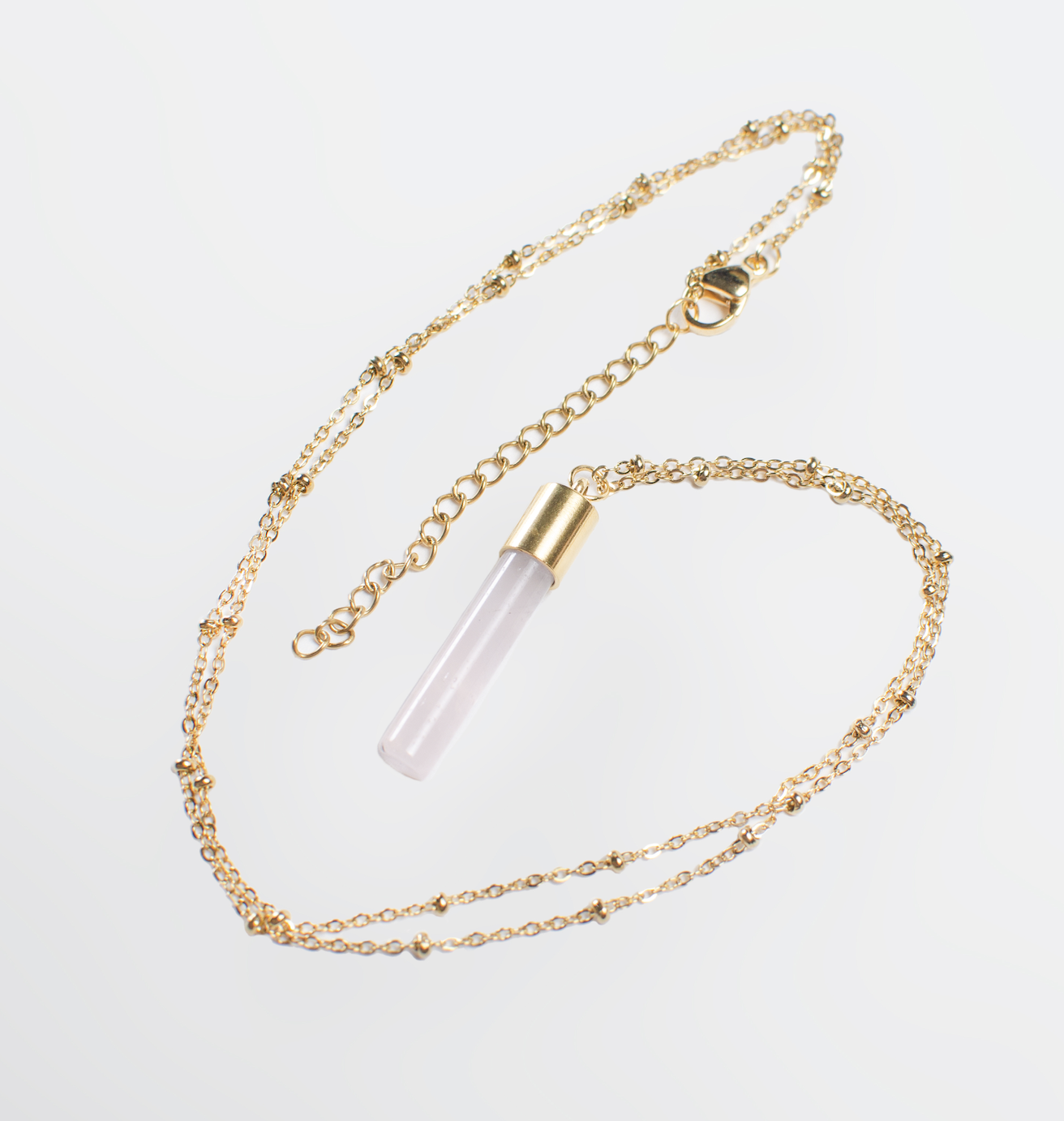 Este dije de curzo rosa con cadena dorada captura la belleza y la energia del cuarzo rosa. El curazo en forma de barra tubular. irradia la sensación de calma y amor propio. Perfecto psrs conectar con tu interior y añadir un toque de delicadeza a tu look.