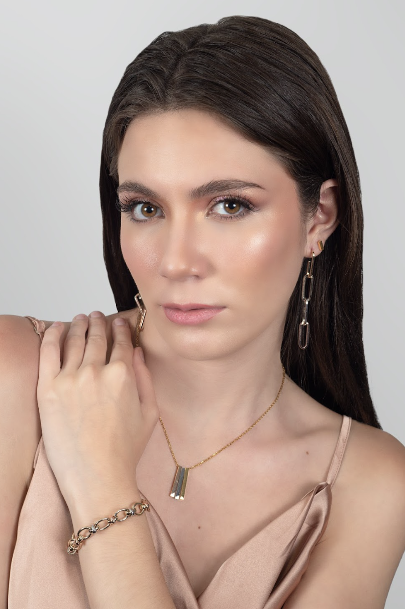 Ests conjunto de collar y aretes es una oda a la simplicidad y la sofisticación. Las tres barras del metal, en acabados drado, plateado y rosé. crean un juego visual que capturan la atencion. Prefecto para quienes buscan un accesorio que complemente cualquier lookj