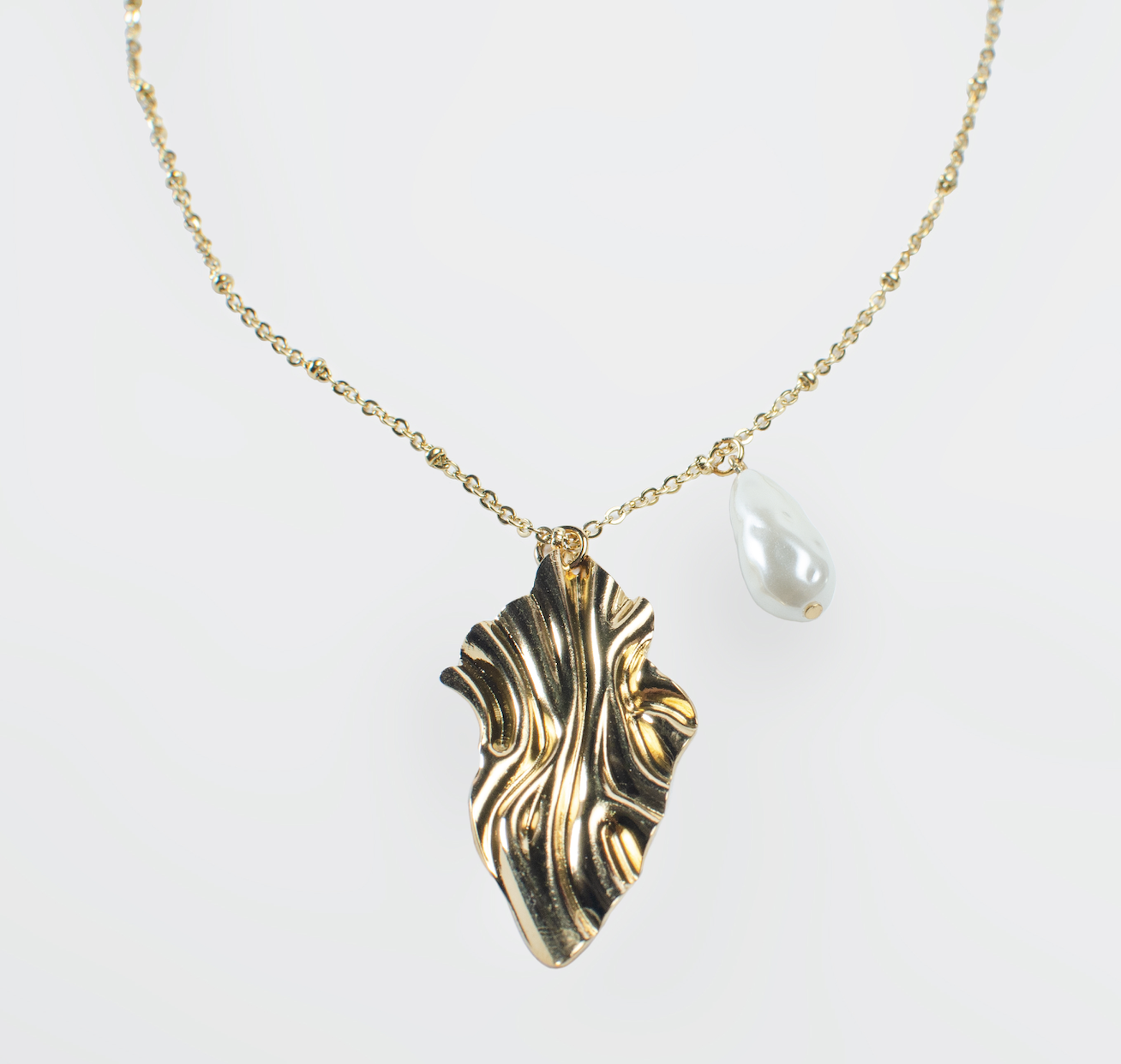 Este diseño original de collar con dije en diseño abstracto, combina la elegancia de la perla con la originalidad del diseño organico. El dije de acero texturizado añade un toque moderno y sofisticado, mientras que la perla aporta un toque clasico.