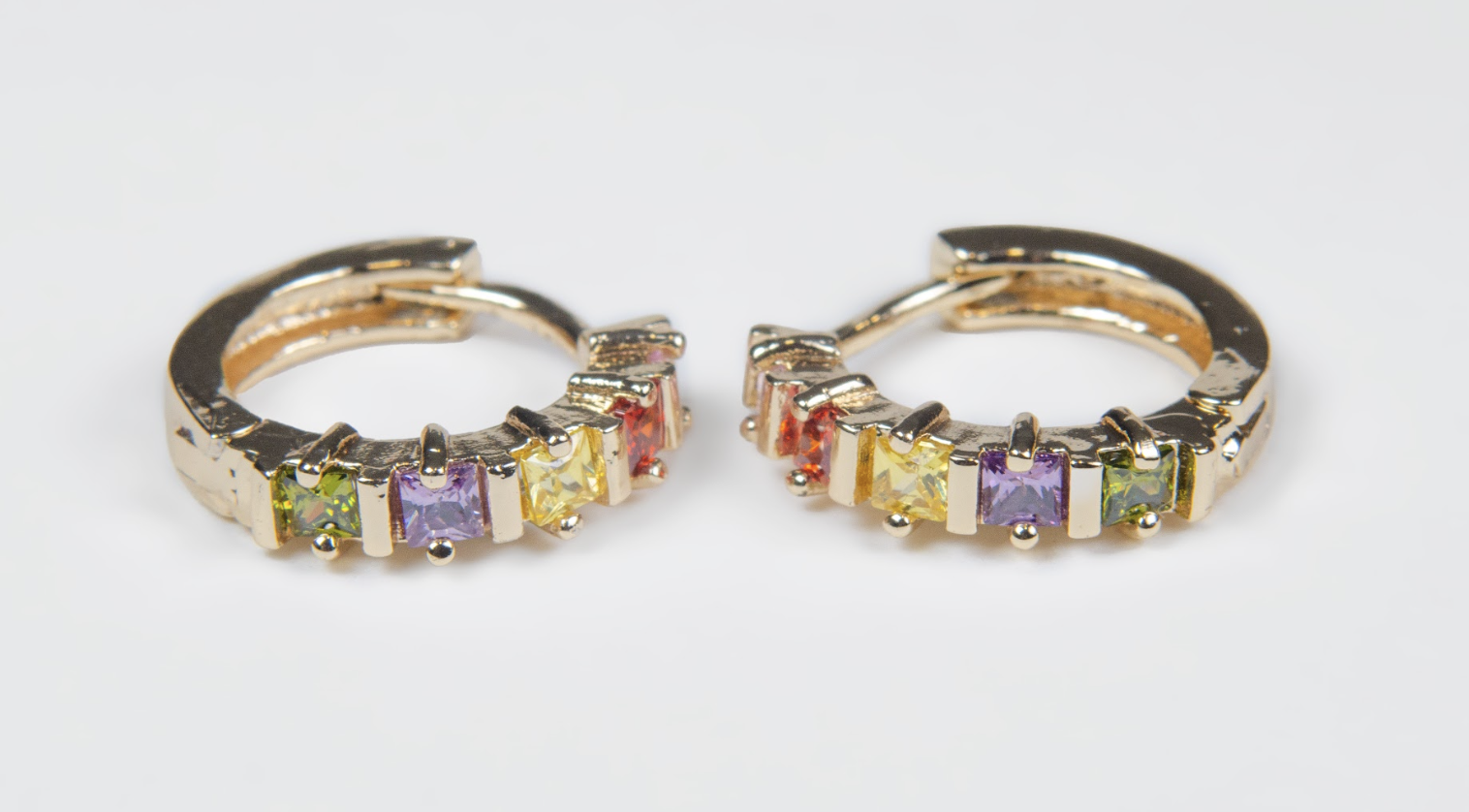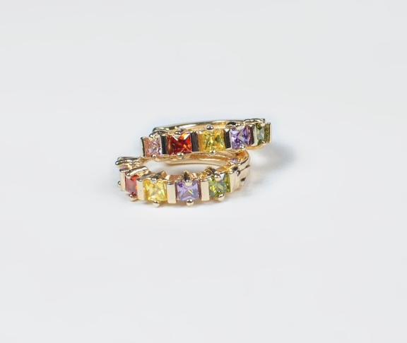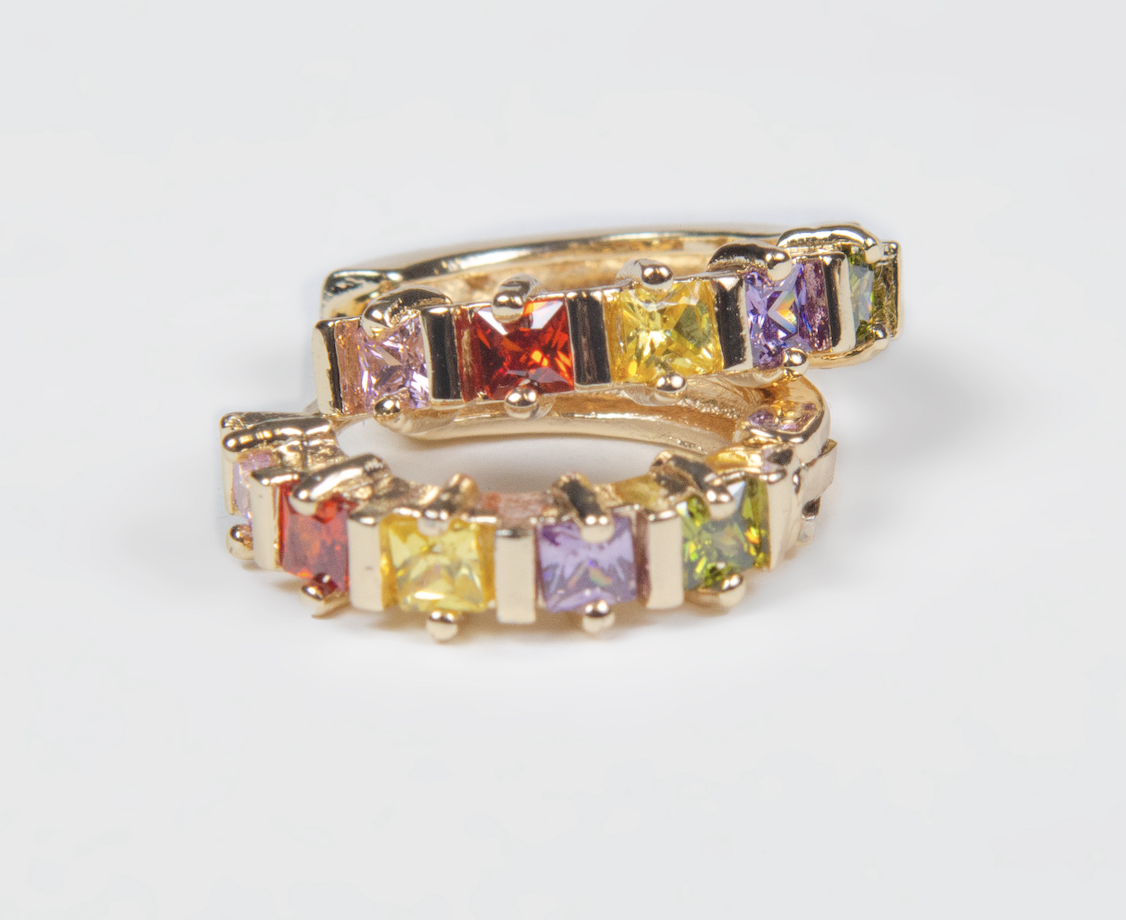 Pendientes de aro huggie color dorados con zirconias de colores.