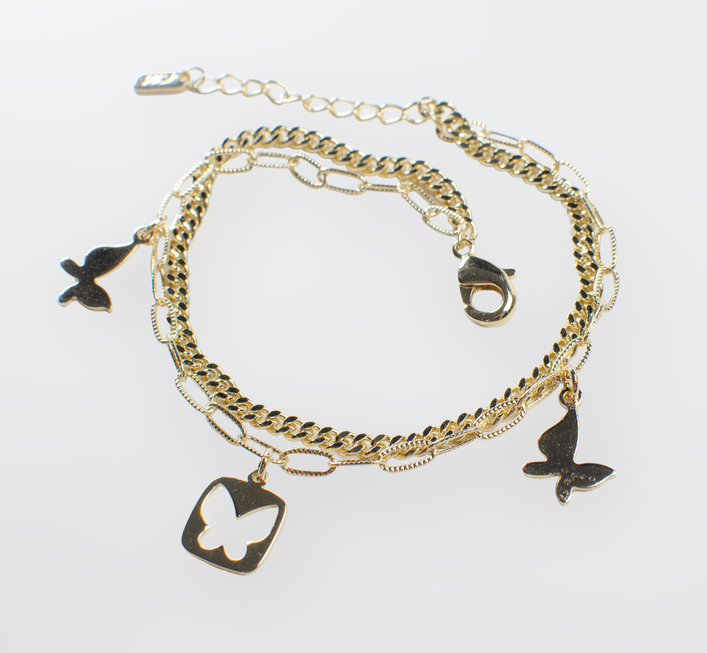 Pulsera de chapa de oro en 18 kilates con doble cadena y dijes de mariposas.
